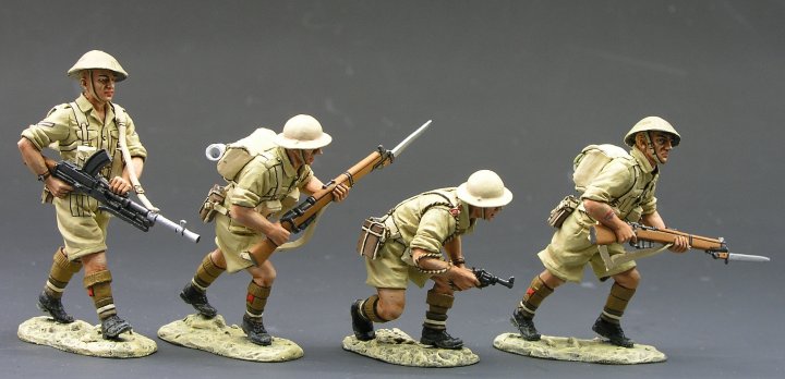 A crouching British officer pistol in hand, leads his men towards the enemy. Two additional desert “Tommies” follow their officer with Lee Enfields and fixed bayonets. Backing them up is an advancing Bren Gunner firing his weapon from the waist.