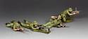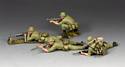 A kneeling NCO (non commissioned officer) kneels and opens fire with his Australian-made Owen Submachine Gun. Backing him up are two lying prone soldiers... one fires the American M60, belt-fed machine gun while the other utilizes the standard L1A1 SLR (self loading rifle). The fourth member of the section is the radio man holding his M16 rifle in one hand while he calls in a SITREP (situation report) on the handset of his PRC-25 radio set.