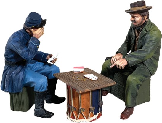 For the most part war is comprised of hours of boredom punctuated by moments of violence. To fill the monotony inbetween, soldiers would tend to their kit and drill. Some gathered in song and played musical instruments. Others read or wrote letters home. Or they gambled. While many officers discouraged gambling, some did not. Union Generals Phil Sheridan and U.S. Grant were avid poker players. As were Confederate Generals Nathan Bedford Forrest and John Bell Hood; Robert E. Lee was not found of gambling. The game of poker spread across America with the Mississippi riverboat, so much so that the term “Riverboat Gambler” would be used to describe any nattily dressed highroller. Far too often such cardsharps would wander into camp and take advantage of some poor, bewildered farmboy to separate him from his wages.