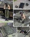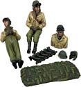 Two figures in this set wear the U.S. Tanker helmet. In 1938, the Ordnance Board initiated design work that would set a single standard for a new and improved tanker helmet. Based on previous tests, the Ordnance Board decided that the helmet already being tested by Rawlings Manufacturing Company was the best option. On 1 May 1941 Rawlings would file for patent on what they simply called a “Tank Helmet.” Later this helmet would be designated M1938. The most distinctive feature of this helmet versus previous designs was the leather ear flap assembly. The earflap extended well below the wearer’s ear and contained a device with a flexible housing for retaining the earphones in their proper position. The M1938 tank helmet continued in service through the late 1950s.