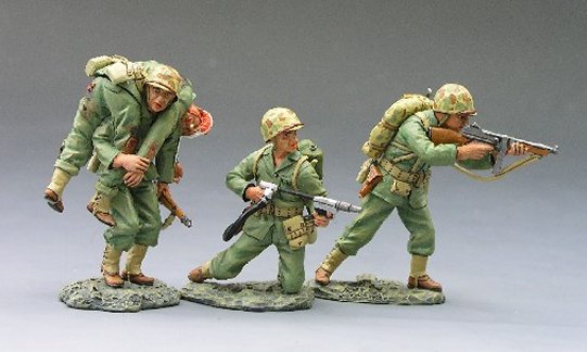 As Admiral Nimitz said about the Marines on Iwo “Uncommon valor was a common virtue”. This set illustrates just that… A seriously wounded Marine is carried to safety on the shoulders of another. A Marine with a flame thrower and an NCO with a “Tommy-gun” try to keep the enemies heads down.